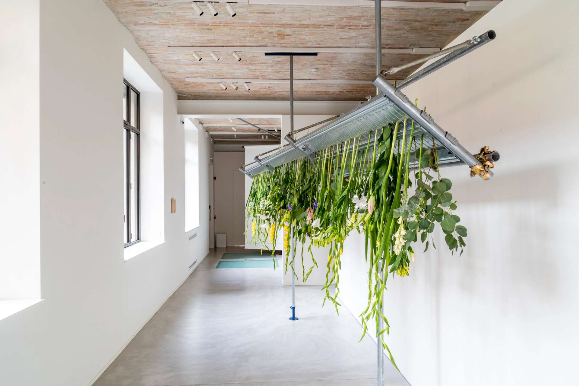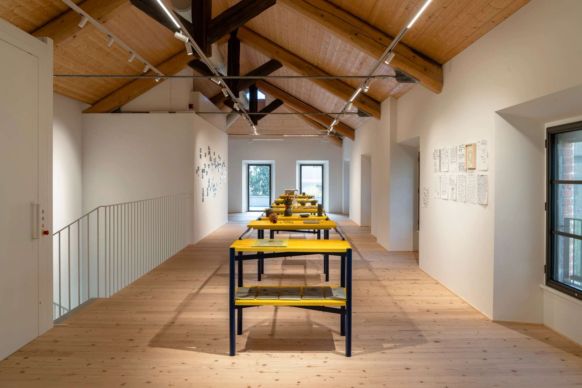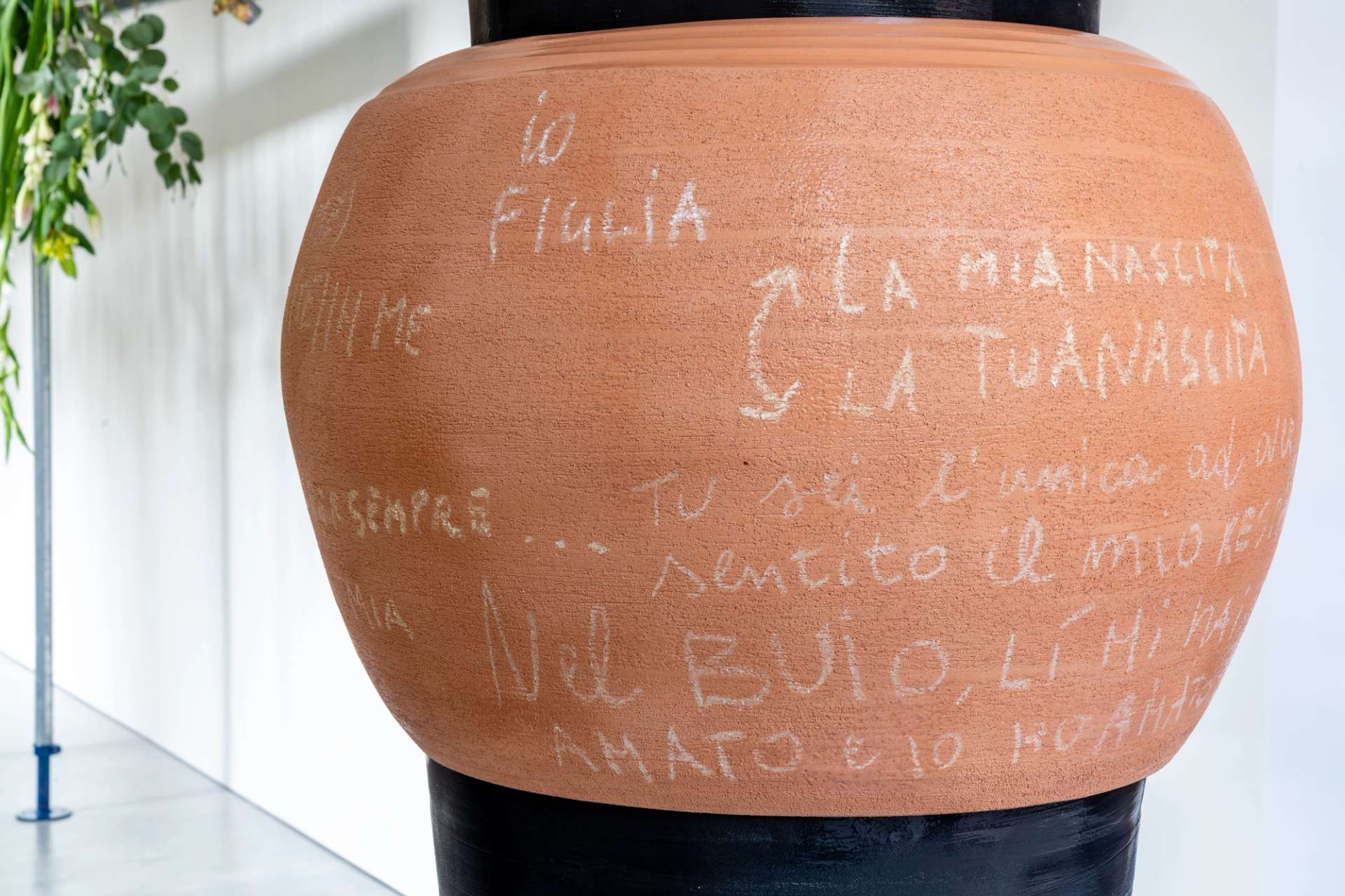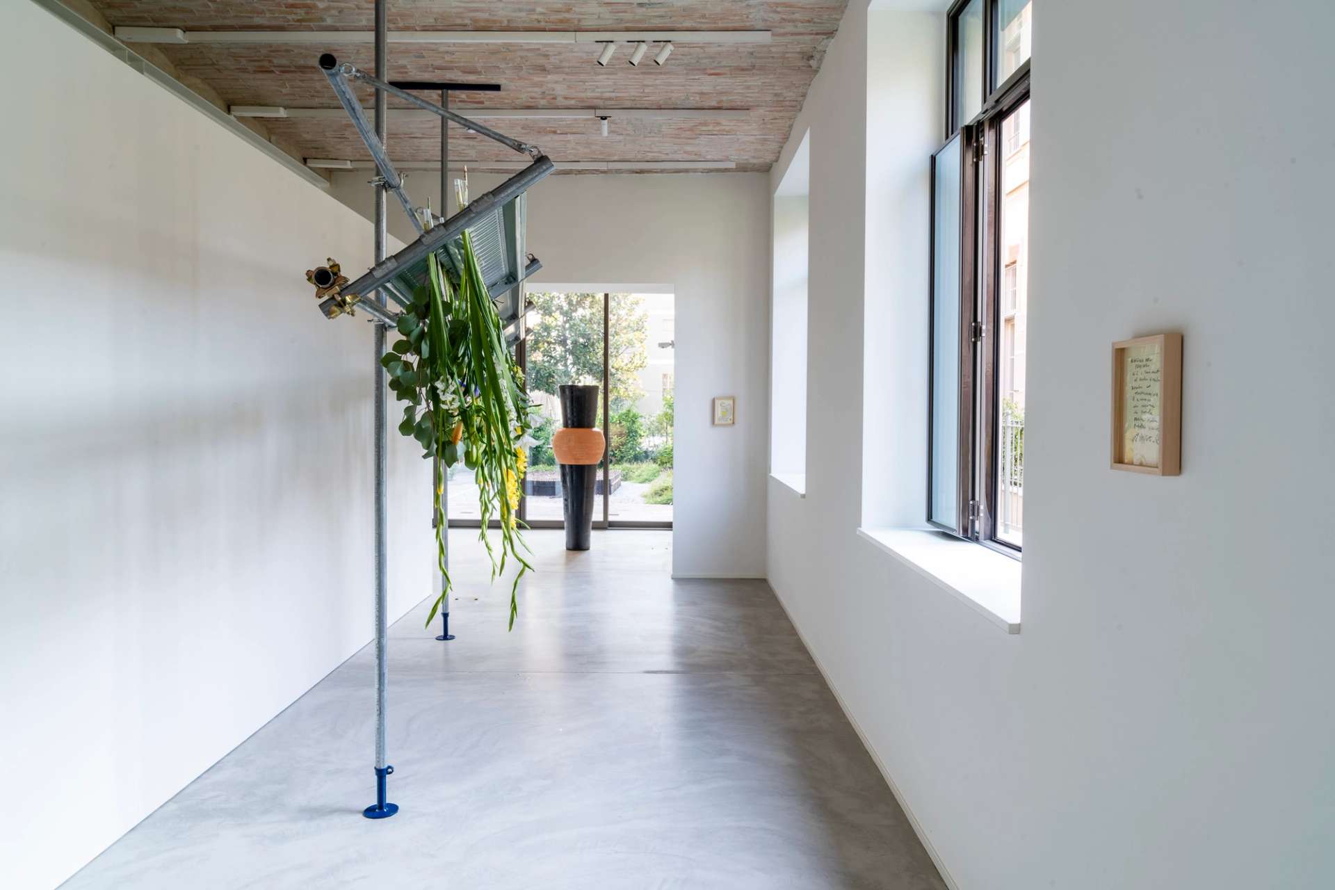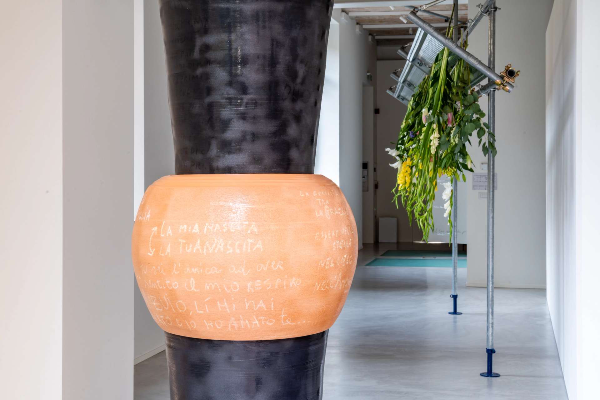 Al piano superiore si entra in uno spazio dedicato al lavoro collettivo di dodici persone, compresa l’artista. I cicli vitali della mostra, scanditi dalla modificazione continua di Edilizia di un Pensiero e dalle attività del laboratorio, segnano una vera trasformazione allestitiva. Con il passare del tempo, la struttura aperta e versatile di un luogo dedicato al lavoro e all’esplorazione si cristallizza in una struttura più canonica, dedicata a presentare ogni singolo percorso e la sua finalizzazione. I piccoli gesti generosi di chi ha vissuto la mostra e si è aperto ad una collettività acquisiscono una loro autonomia sotto forma di foto, appunti ed esercizi corporei, diventando traduzioni di un processo organico. Nella solidarietà reciproca ogni singola voce collima in una pluralità complessa, secondo i legami introdotti al piano inferiore. Mesi di lavoro e la collaborazione con ceramisti, architetti e un ricercatore nel campo dell’edibile si rivelano fondamentali per arrivare alla definizione di autoritratti sotto forma di vaso e attivare al loro interno un’ulteriore trasformazione fisica e simbolica.
